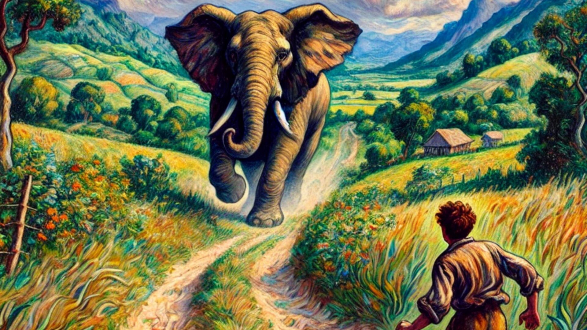 “Turn around and run!” shouted the young man as he panted for breath, “There is a mad elephant a small distance away, coming our way!”